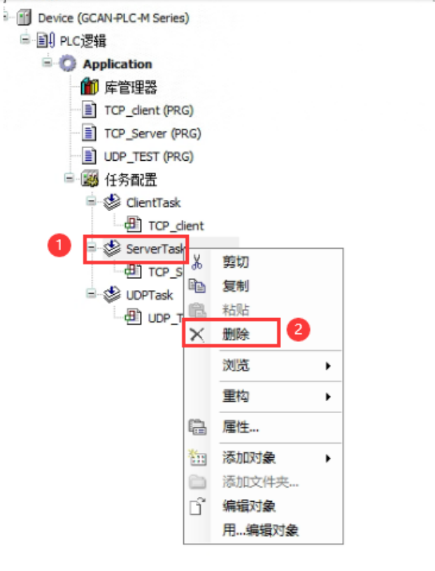 4.1 删除任务操作(以以太网程序为例):在删除任务上右键→删除