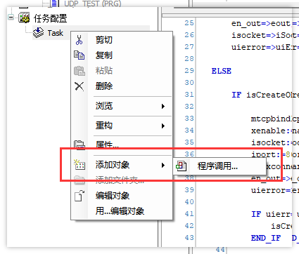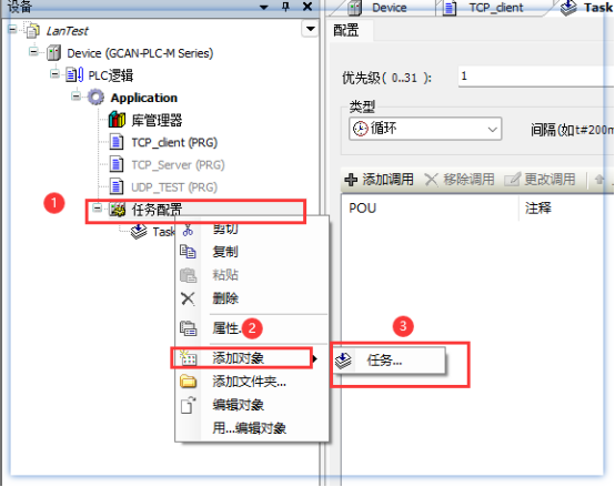 4.2 添加任务的方法(以以太网程序为例):任务配置右键→添加对象→任务...→输入名称(也可以用默认名称)→添加