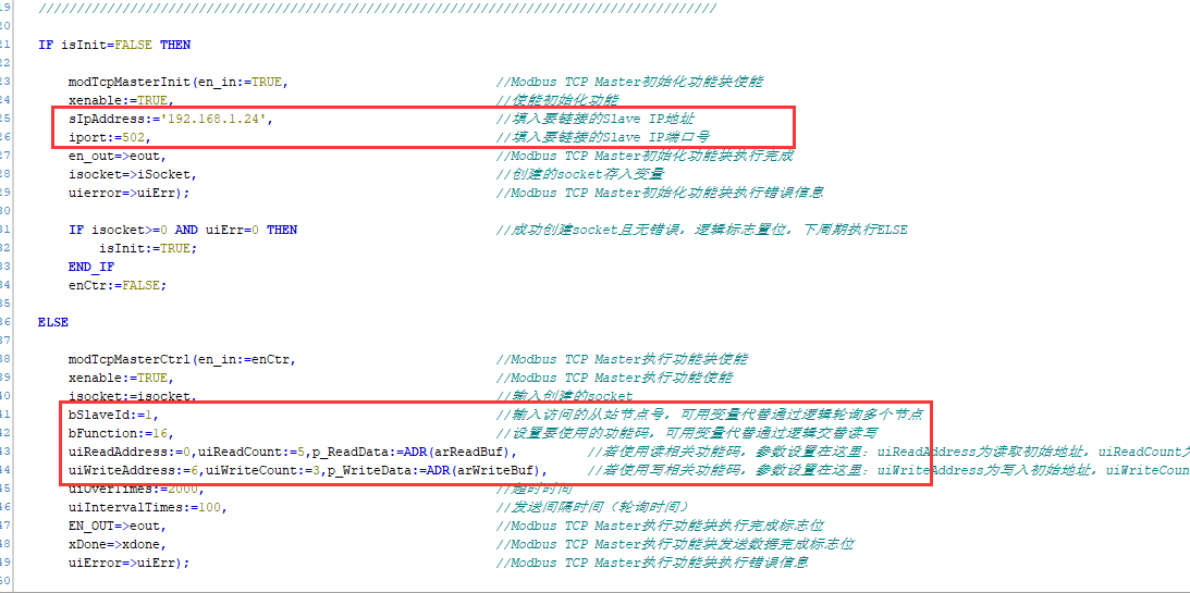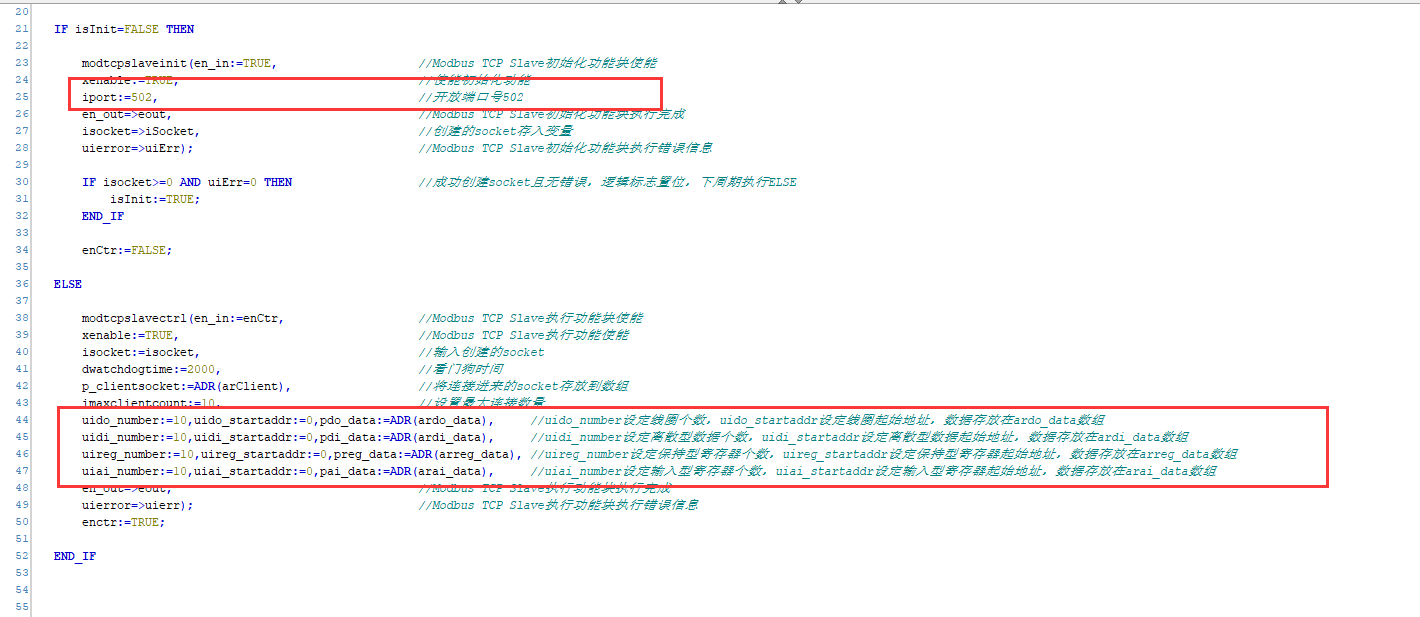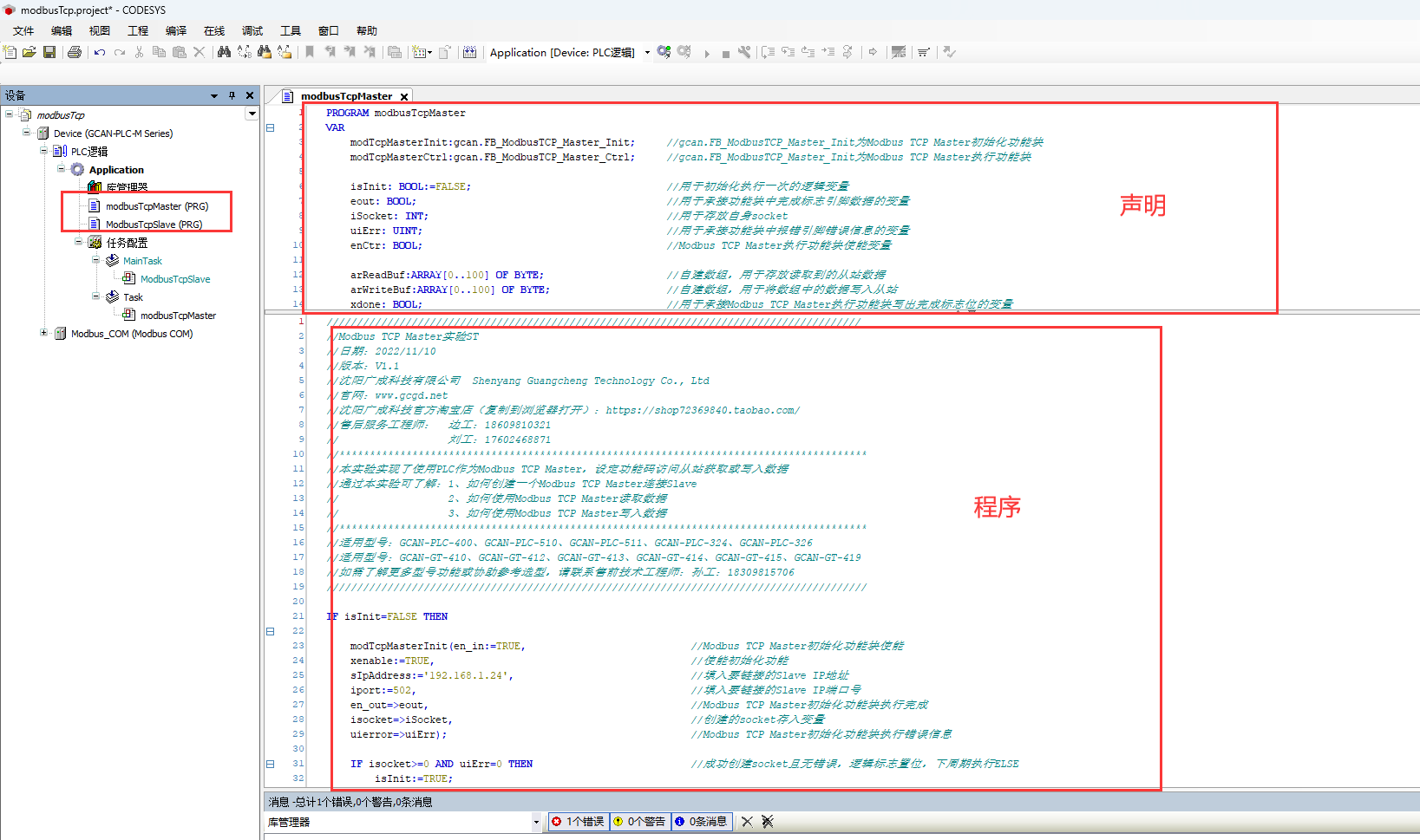 2.打开modbusTcpMaster (PRG)或ModbusTcpSlave (PRG),上半部分为程序声明,下半部分为具体程序。
