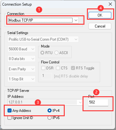 2.选择Modbus TCP/IP→Port:502→选择ipv4(注意这个ipv4为电脑网口的ipv4,这个IP要与程序中从站的ip地址一致)→OK