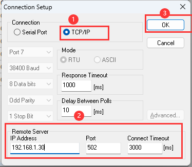 2.选择TCP/IP→输入从站IP:192.168.1.30,端口:502,连接超时时间(根据自己需要设定)→OK