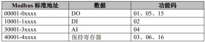 (三)Modbus 标准地址与各个功能码的对应关系如下所示