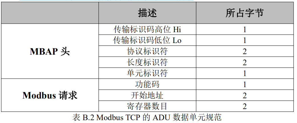Modbus TCP 的 ADU 数据单元规范如表 B.1 所示