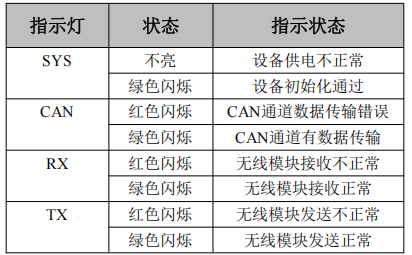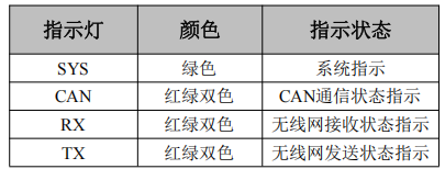 - 无线与CAN均连接正常后,当有数据在CAN与无线之间传输时,相应的CAN、无线指示灯绿色闪烁;