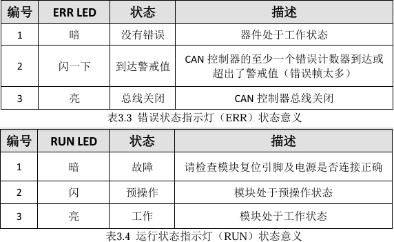 按照CANopen协议规范文档DS303-3的定义,在GCAN-305模块中使用两个LED指示灯来指示当前模块所处的状态,如表3.2所示。