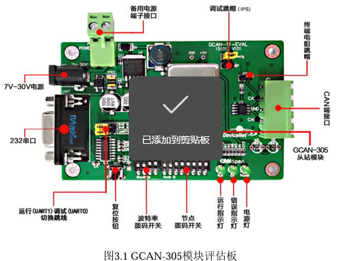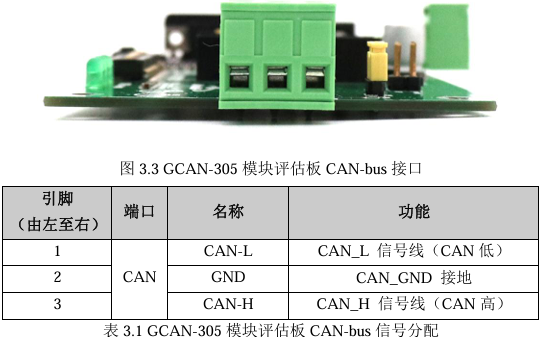 GCAN-305 模块评估板CAN-bus接口由1个3 Pin接线端子引出,可以用于连接1个CAN-bus网络或者CAN-bus接口的设备,其接口位置及接口定义如图3.3、表3.1 所示。