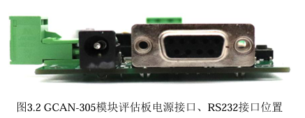 GCAN-305 模块评估板集成1路DC 7-30V电源接口、1路备用电源接口、1路标准CAN-Bus接口、1路标准RS232接口。GCAN-305模块评估板电源接口、RS232接口位置下图3.2所示: