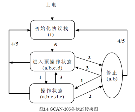 GCAN-305各状态转换图如图3.4所示,图中各字母所表示的各种状态下可进行的操作,字母表达的操作为: