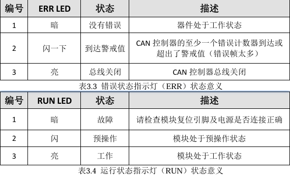 按照CANopen协议规范文档DS303-3的定义,在GCAN-305模块中使用两个LED指示灯来指示当前模块所处的状态,如表3.2所示。
