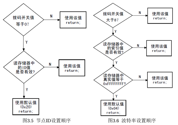 GCAN-305 模块提供三种方式设置节点ID和节点波特率,其设置顺序如图3.5和图3.6 所示。如果用户所使用的拨码开关值有效,则上电时启用该值,即使在存储器中存储有合法的 ID 值都不会使用。如果模块在运行期间,主站对模块进行了LSS 设置,则使用LSS设置后的值,但是模块重新上电或重启之后,依然使用拨码开关的值。