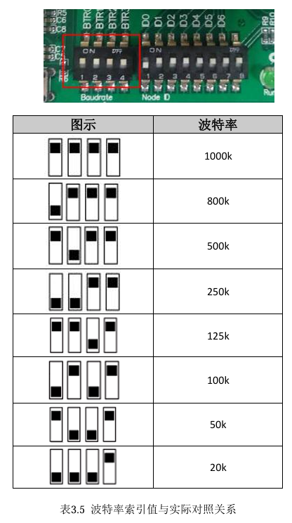 其中设置节点ID的拨码开关使用7位,当其值为0时,表示拨码开关无效,取值范围为1~127之间。波特率索引值使用4位拨码,向上拨动为0,向下拨动为1。当波特率拨码开关4为1(即拨码开关4向下),此时波特率由软件决定。当波特率拨码开关4为0(即拨码开关4向上),波特率值由拨码开关决定,详情参见表3.5。
