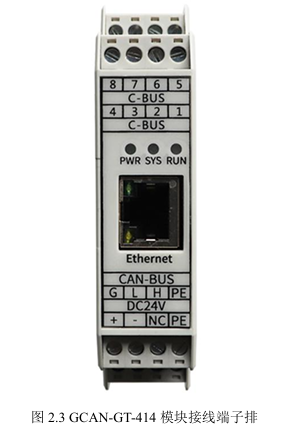GCAN-GT-414 模块集成1路DC24V电源接口、4路标准CAN-Bus接口、1路标准太网接口,GCAN-GT-414模块接线端子排如图2.3所示。