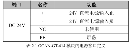 GCAN-GT-414 模块的电源接口由1个4Pin插拔式接线端子引出,其接口定义如表2.1所示。