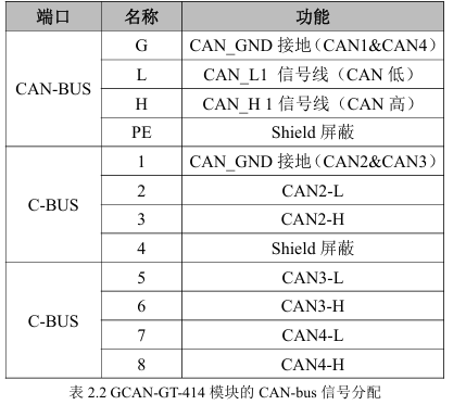 GCAN-GT-414 模块 CAN-bus 接口由 3个4Pin接线端子引出,可以用于连接4个CAN-bus网络或者CAN-bus接口的设备,其接口定义如表2.2所示。