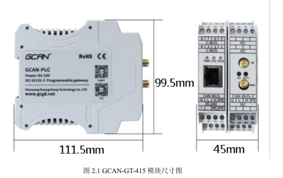 设备外形尺寸:(长,含接线端子)111.5mm*(宽)45mm*(高)99.5mm,其示意图如图 2.1 所示