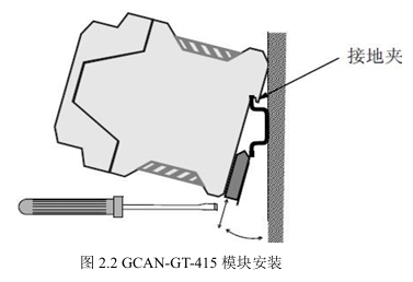 GCAN-GT-415 模块安装方法如图2.2所示,可使用一字螺丝刀辅助将模块安装到DIN导轨上。