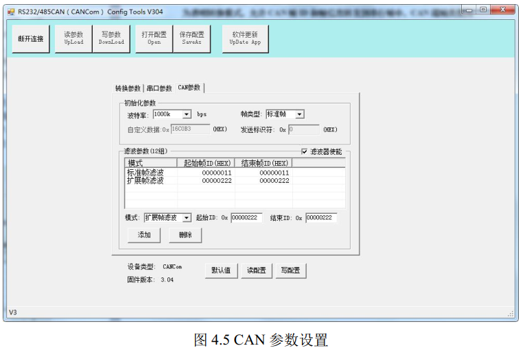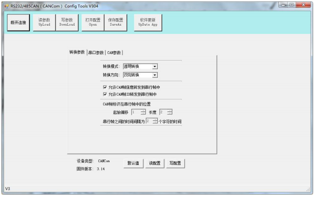 当GCAN-201/207模块进入配置模式且通过串口与 PC 机正常连接后,打开“CANCOM-Config-V304”软件对模块进行配置。软件界面如图所示。