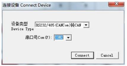 进入软件后,选择连接到GCAN-201/207的串口号,点击“连接设备”即可建立连接。如用户不知道串口号,可通过进入 PC 机的设备管理器中查看。