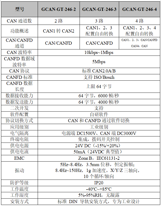 GCAN-GT-246-4集成4路CAN接口,4路CAN接口之间可通过软件自由配置转换,CAN1、CAN2、CAN3均支持CAN/CANFD协议,CAN4只支持CAN协议。单向转换时间2ms。