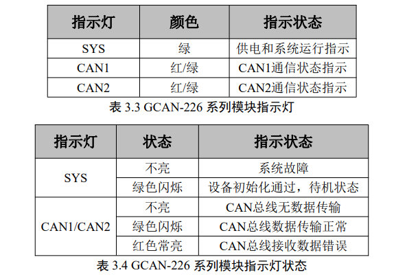 GCAN-226系列模块具有1个PWR指示灯用来情况,1个SYS指示灯用来指示系统供电和系统的运行状态,2个CAN指示灯用来指示对应CAN总线通信状态。这3个指示灯的具体指示功能见表3.3,这3个指示灯处于各种状态的含义如表3.4所示。