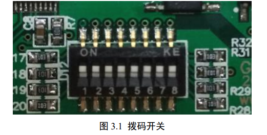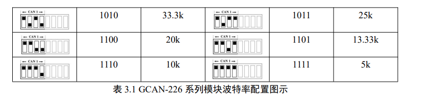 当用户第一次使用 GCAN-226 模块时,可先打开设备外壳,直接使用设备内部的拨码开关调整对应 CAN 总线的波特率。拨码开关如图。