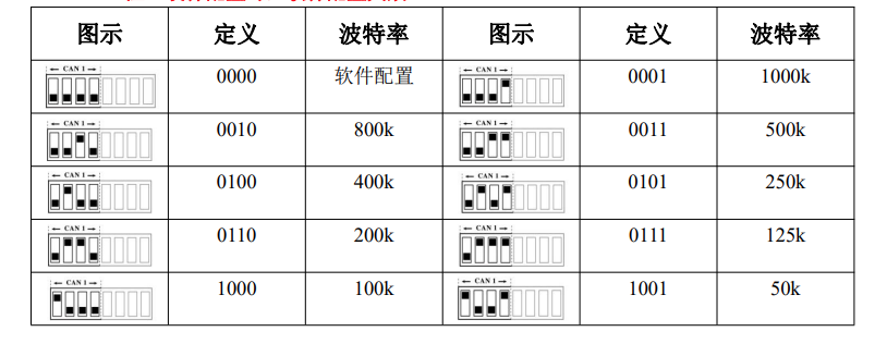 码开关设置波特率方法:系统先不要上电,用螺丝刀撬动绿色外壳,拿掉外壳主体,找到设备中如上图所示的拨码开关,拨码开关的“1、2、3、4”号可以对CAN1波特率进行配置,“5、6、7、8”号可以对CAN2波特率进行配置。具体配置方法以CAN1为例,详见表3.1。ON方向为1,数字方向为0。