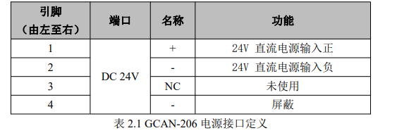 GCAN-206 模块的电源接口由 1 个 4Pin 插拔式接线端子引出,其接口定义如表 2.1 所示。