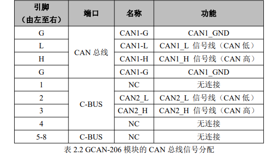 GCAN-206 模块 CAN 总线接口由 2 个 4Pin 接线端子引出,可以用于连接 2个 CAN 总线网络或者 CAN 总线接口的设备,其接口定义如表 2.2 所示。