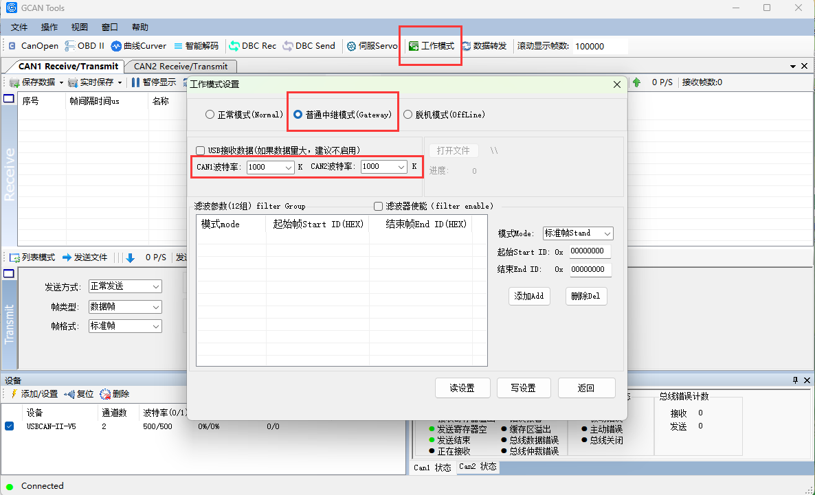 使用GCANTools软件将设备工作模式切换为中继模式即可。