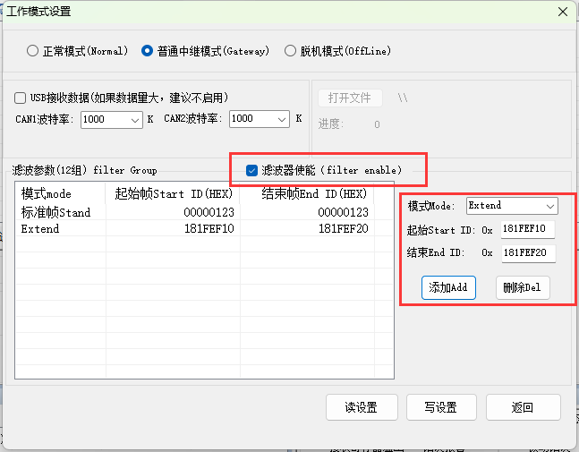 勾选滤波器使能,添加 Add,使用中继滤波功能。可以同时设置标准帧或者扩展帧,滤波参数最多12组。如图流程。