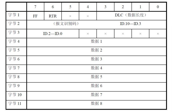 CAN 标准帧信息为11个字节,包括两部分:信息和数据部分。前3个字节为信息部分.