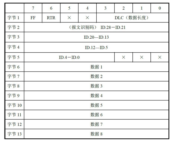 CAN 扩展帧信息为13个字节,包括两部分,信息和数据部分。前5个字节为信息部分。