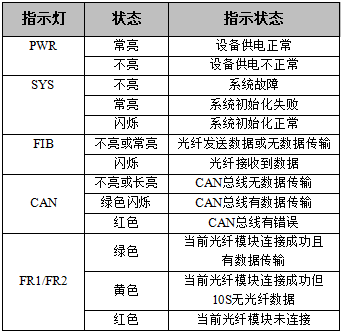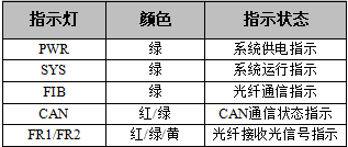 GCAN-208-2-FA系列模块具有1个PWR指示灯用来指示系统供电情况,1个SYS指示灯用来指示设备的运行状态,1个FIB指示灯用来指示光纤数据传输,2个FR指示灯用来指示光纤模块接收光信号状态,1个CAN指示灯用来指示CAN总线数据传输。这5个指示灯的具体指示功能见表3.3,这5个指示灯处于各种状态的含义如表3.4所示。