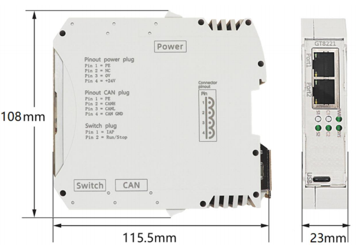GCAN-GT-8221系列分为GCAN-GT-8221CAN和GCAN-GT-8221COM两种型号。 GCAN-GT-8221CAN是Ethercat转CAN通讯的网关模块; GCAN-GT-8221COM是Ethercat转Can Open通讯的网关模块; 两者“模块外观及尺寸”一致。