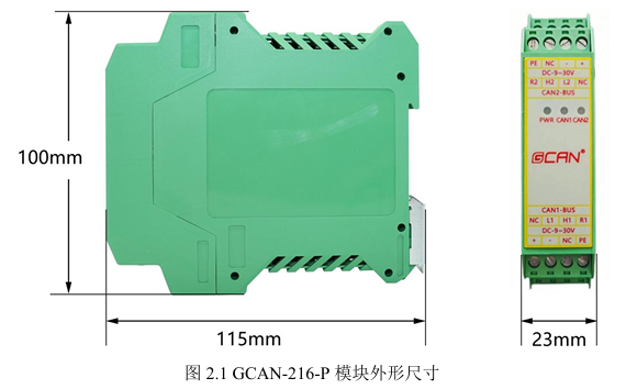 设备外形尺寸:(长,含接线端子)115mm*(宽)23mm*(高)100mm,其示意图如图2.1所示。