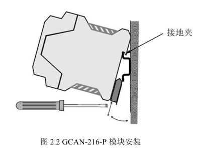 GCAN-216-P 模块安装方法如图2.2所示,可使用一字螺丝刀辅助将模块安装到DIN导轨上。