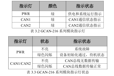 GCAN-216系列模块具有1个PWR指示灯用来情况,1个SYS指示灯用来指示系统供电和系统的运行状态,2个CAN指示灯用来指示对应CAN总线通信状态。这3个指示灯的具体指示功能见表3.2,这3个指示灯处于各种状态的含义如表3.3所示。