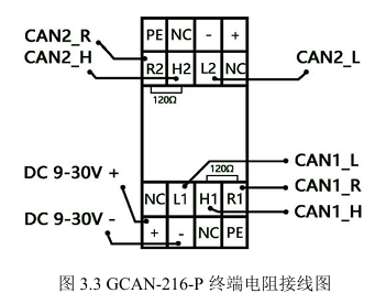 请注意:GCAN-216-P模块内部已集成120Ω终端电阻,可通过自己接线是否将电阻接入总线,R1、R2分别对应为CAN1、CAN2的终端电阻,H1连线R1即可启用CAN1端终端电阻,H2连线R2即可启用CAN2端终端电阻。接线如图所示: