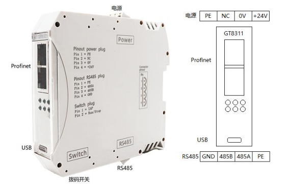 GCAN-GT-8311-MRTUM 模块集成 1 路 24V DC 电源接口、2 个标准 Profinet接口、1 个标准以太网接口、1 路标准 RS485 接口,GCAN-GT-8311-MRTUM 模块接线端子如下图所示。