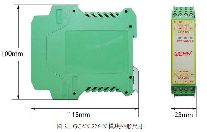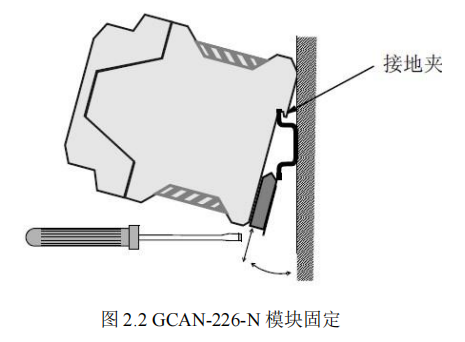 GCAN-226-N 模块安装方法如图 2.2 所示,可使用一字螺丝刀辅助将模块安装到 DIN 导轨上。