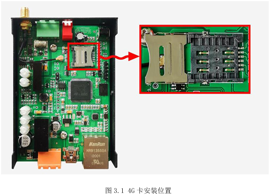 GCAN-218 模块使用+9~24V DC供电(推荐使用+12V或+24V标准电源供电)。218 需要一张4G物联卡或手机卡。将手机卡或物联卡放入卡槽内。如图所示,需要先将外壳拆开,将4G卡安装在红框内的插槽中。然后将附赠的天线接上。