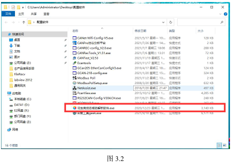用USBmini线将电脑与设备相连接,此时SYS处于蓝色闪烁状态。在相关资料中选择如图3.7所示的配置软件“GCAN-218-config.exe”