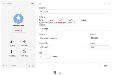 如图3.6所示,进入配置页面后,在应用类型处选择TCP,内网主机选择电脑IP(电脑需联网),端口填写8001(端口任意填写,本文以8001举例)。设置完成点击保存,花生壳映射即创建完成。
