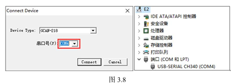 双击此配置软件后,如图3.8所示,桌面显示一个ConnectDevice窗口,此时查看电脑设备管理器中的端口号为COM4(每个电脑的端口号不同,本文以COM4为例进行讲解),此时ConnectDevice窗口中的串口号要与设备管理器中的端口号保持一致选择COM4,然后点击Connect