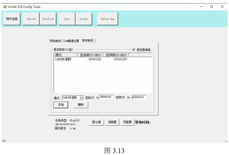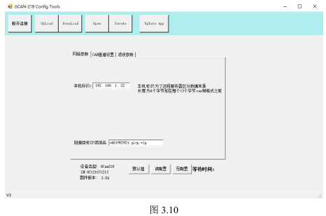如图3.10所示,配置软件共有三个配置页面分别为“网络参数”、“CAN通道设置”、“滤波设置”。