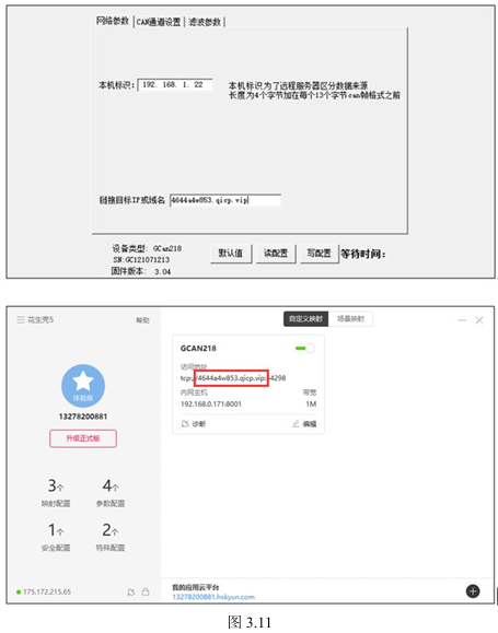 如图3.11所示,网络参数页面一共可以配置两处,一处为“本机标识”,一处为“链接目标IP或域名”;“本机标识”用于远程服务器区分数据来源,可根据需求进行更改。“链接目标IP或域名”此处填写之前所建立的映射的地址,即下图中红色方框内的内容。