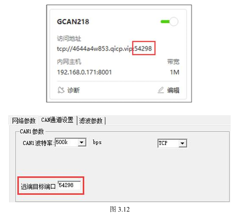 如图3.12所示,在CAN通道设置页面一共可配置三处,一处为“CAN1波特率”,一处为“TCP/UDP”;一处为“远端目标端口”;“CAN1波特率”为GCAN-218 与CAN端通信时的波特率,可根据需求进行更改(注意:此处可更改的波特率均为CAN总线标准波特率,如有非标波特率的相关需求,应联系广成科技售后人员进行处理);“TCP/UDP”为TCP/UDP模式切换,TCP模式可使用花生壳映射,UDP模式必须有真实IP服务器;“远端目标端口”应与之前设定的花生壳映射中端口号保持一致。