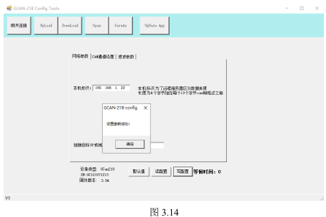 如图3.14所示,所有参数设置完成后点击写配置,等待一段时间后,会有弹窗弹出提示“设置参数成功!”,点击确定。此时参数已经设置成功,需设备重新上电后使用方可生效。