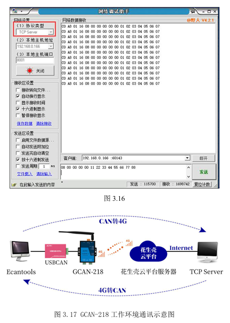 如图3.16所示,在协议类型处选择“TCPServer”,本机服务地址选择与花生壳映射中内网主机相同的地址,本机主机端口选择与花生壳映射中内网端口相同的端口号,点击打开后再客户端一栏处选择相应的IP地址。即可就收到CAN端发来的数据,如想给CAN端发送数据,则可以在发送框内进行发送,具体发送格式详见附录。