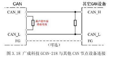 为了增强CAN通讯的可靠性,消除CAN总线终端信号反射干扰,CAN总线网络最远的两个端点通常要加入终端匹配电阻,如图3.18所示。终端匹配电阻的值由传输电缆的特性阻抗所决定。例如双绞线的特性阻抗为120Ω,则总线上的两个端点也应集成120Ω终端电阻。广成科技GCAN-218接口卡采用82C251收发器,如果网络上其他节点使用不同的收发器,则终端电阻须另外计算。